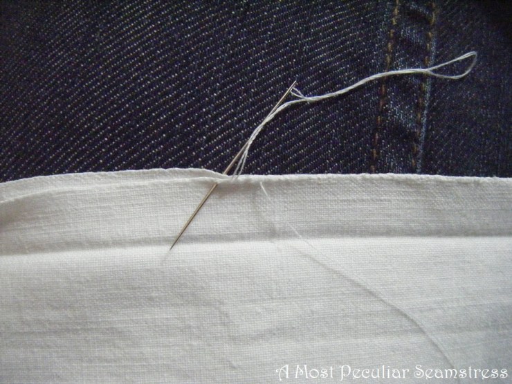 I cut the sheets to the length I wanted, two pieces to be sewn together. As I plan to fold the fabric and sandwich the cords between the layers, I made the pieces a lot longer than the finished petticoat will be. I´m not sure yet how many rows of cording I will have, so I took a bit more fabric than I might actually use (1.5 meters), just in case. The sheets have very nice selvages, so I decided to just whipstich them together, to make as smooth a seam as possible.