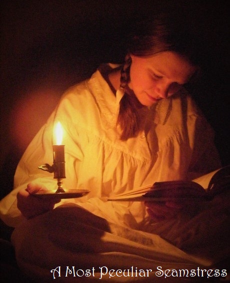 I have a habit of sleeping with my window open as far into the autumn or winter as possible, but at this time of year an extra quilt is nice. Last night I was still a little cold and I dug out a 19th century-ish nightgown I made some ten years ago. The few times I’ve tried it, it’s been very comfortable to sleep in, and it’s so cosy to pull my feet up inside it. To bad you don’t use them anymore… It’s made of a cotton fabric, with hand made bobbin lace round collar and cuffs. All visible seams are hand-sewn. I’m thinking of making a new one, not being completely happy with this. Anyway, here’s a picture of it, taken earlier this year. I was terrified all the time that I should drop the candle and set fire to the bed. The picture turned out nice though.