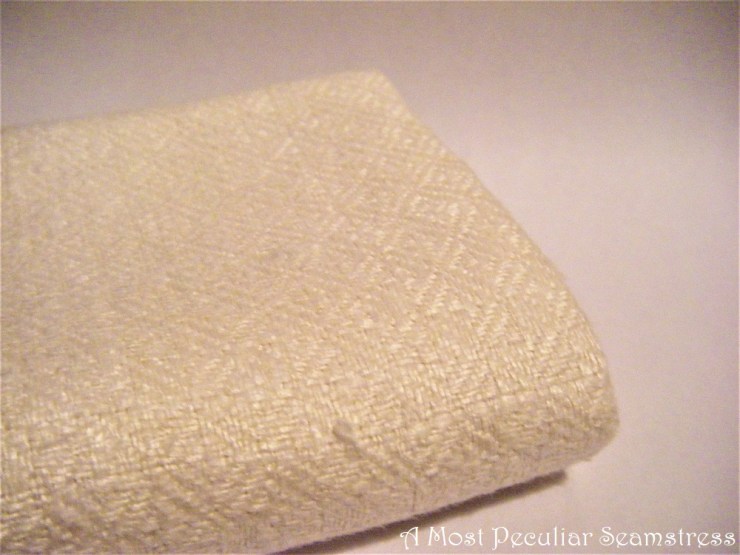 After work I went to the largest charity shop in town and got some very nice things there: three spools of middle weight, bleached linen thread, which I’ll use for sewing period clothing, and a linen dishtowel woven in a diamond twill (I love linen dishtowels).