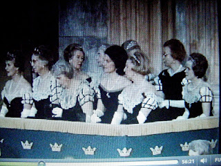 The present queen (Silvia) renewed the court dress in the late 1970's / early 1980's: it is no more worn by the royal ladies but the ladies-in-waiting to the queen when they accompany the queen in official galas. The dress is very beautiful dark blue (royal blue?) velvet with short lattice sleeves. The idea is to spare money as the ladies need not have a new evening gown every time.