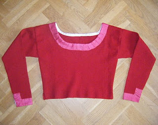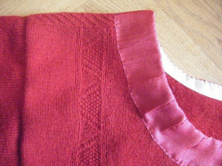 The county Skåne was divided in a lot of smaller areas, and they differed a little, or much, from each other costume wise. In my area, the spedetröja was black, sometimes green, and often red for more festive occasions – then as now, there were clothes for working as well as dressier clothes, and the same went for spedetröjor. The ones not to be used in the everyday work on the farms where frequently decorated with knitted patterns, all over the surface or just in a few borders. They where also decorated at the neck and sleeves with silk or velvet, sometimes several rows of different silk ribbons. From what I’ve been able to find from looking at online museum collections, most of the red ones had trimmings in pink and/or black silk. Since I had pink silk at home, I decided to use that. The way the trimmings looked differed from place to place, but in my area they where generally quite simple, compared to other places.