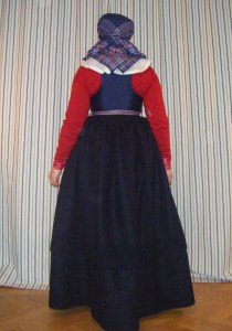 And that’s as far as I’ve come. I will, when the money, wish and time is there, add spedetröjor, liv and skirts in other colours, aprons in different patterns and materials, and several opplöts, so I can mix and match according to my mood. When it looks like I’m likely to marry, I’ll start to embroider the white headdress. But the costume is perfectly appropriate to wear as it is now. Yay!