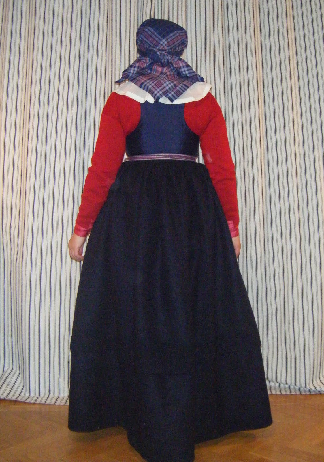 My folk costume from the south-west corner (more specifically, Oxie, Vemmenhögs, Skytts och Bara härader), of the county Skåne (Scania) in the very south of Sweden, is, after having working on it for the past year or so, now almost completed – enough for it to be worn anyway. I will now show it, layer by layer. This is what an unmarried farmer’s daughter of rather comfortable means might have worn to church and parties in about 1820-50. I’m afraid there’re no close ups, since the batteries in my camera died, and some of the pictures aren’t very good for the same reason. I’ve linked to previous posts on the different garments, in case anyone would like to go back and learn more about them.