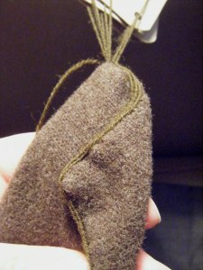 I won’t go into the basics of tablet weaving now – if you don’t know how it works, google it or look it up on youtube. I used three tablets, all four holes threaded with fine, three strand wool yarn that i had in my stash, folded in the edges of the fabrics a little, and then started weaving. Every time I had pulled the yarn through the warp threads, I made a tiny stitch through both the layers of fabric, so the weft thread really made a sort of circle: through the warp, stitch through the fabrics, turn the tablets, through the warp etc.