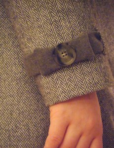 The coat was made using herringbone wool in grey and off white, which I had in my stash. I didn’t have very much of it, just 150×180 cm (about 59x71”), which presented a problem. I like my coats to be long (usually longer than this), as I get cold easily, and prefer them to be wide at the hem as I wear skirts or dresses with a bit of width most of the time. The answer was to use a different fabric for the details (collar, placket, belt and sleeve ornaments). This fabric, gray wool, was also one I had in my stash, and as with the herringbone fabric, there was just enough to squeeze the pieces I wanted from it. In fact, I had so little of either fabric that I had to use a third woollen fabric for the facing on the front and the collar. It took quite some time to work out how to make a coat out of so little fabric, but I’m pretty pleased with how it turned out. I would have preferred a bit more width at the hem, but beggars cannot be choosers….