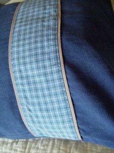 The second one has a simple strip of cotton plaid, appliquéd with spaced back stitches to a herringbone cotton fabric, with folded fabric strips between, like flat piping. Simple, but I like it very much. Again, the fabrics used to be clothes of mine. Waste not….