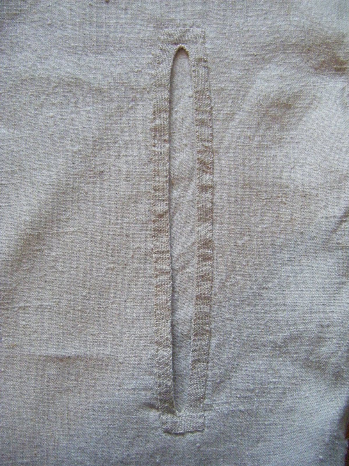 I made the nursing slits by simply cutting a slit where I wanted it (following the grain of the fabric exactly to prevent stretching), cutting a corresponding slit in a narrow strip of linen, folding each under three millimetres or so, and whipping them together. I then sewed the outer edges of the strip to the shift. I suppose you could just sew buttonhole or blanket stitches around the edges of the slits, or make simple hems, but this seemed the best method to make them strong as well as preventing them from gaping more than necessary. I’ll let you know how they work out in action.