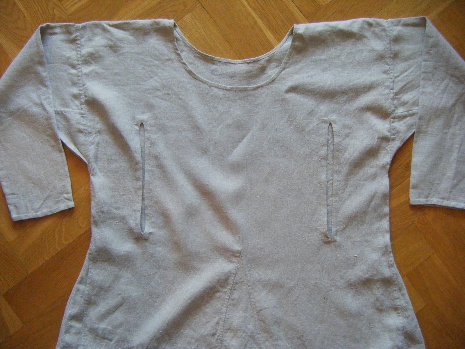 After finishing the pillow cases I posted about before, I decided to make nursing slits in one of my medieval shifts. You can sometimes see nursing slits in period art, situated on the dress in front of each breast, and as you have to be able to gain access through the shift as well, I decided to make some in mine. I put them slightly to the side, to prevent the breasts from poking through. I have heard of reenactors making one deep slit in front, or a neck opening wide enough to pull down, as well as nursing slits, but for me, this seems the most discreet and warm method – I wouldn’t want to risk blocked milk ducts…. (I had it last week, and it was unpleasant, I felt really ill, and it hurt!) As my dresses laces in front I think I’ll be able to wear them unaltered while nursing.