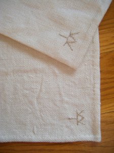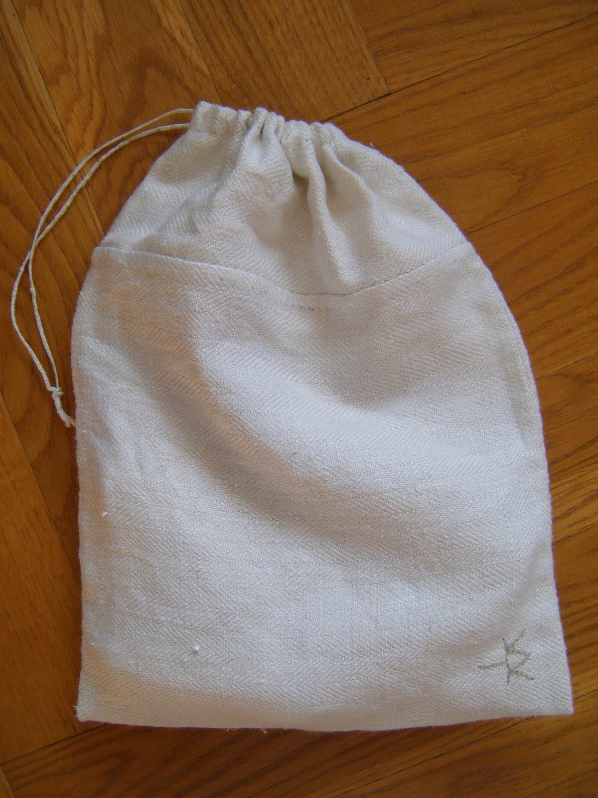 Anyway, we designed a mark for us. It’s just a T and a W on the side (we tried to fit an S in as well, but didn’t manage to make it look good…), but I rather like it. I embroidered it in the corners of the towel and bag with unbleached linen thread.
