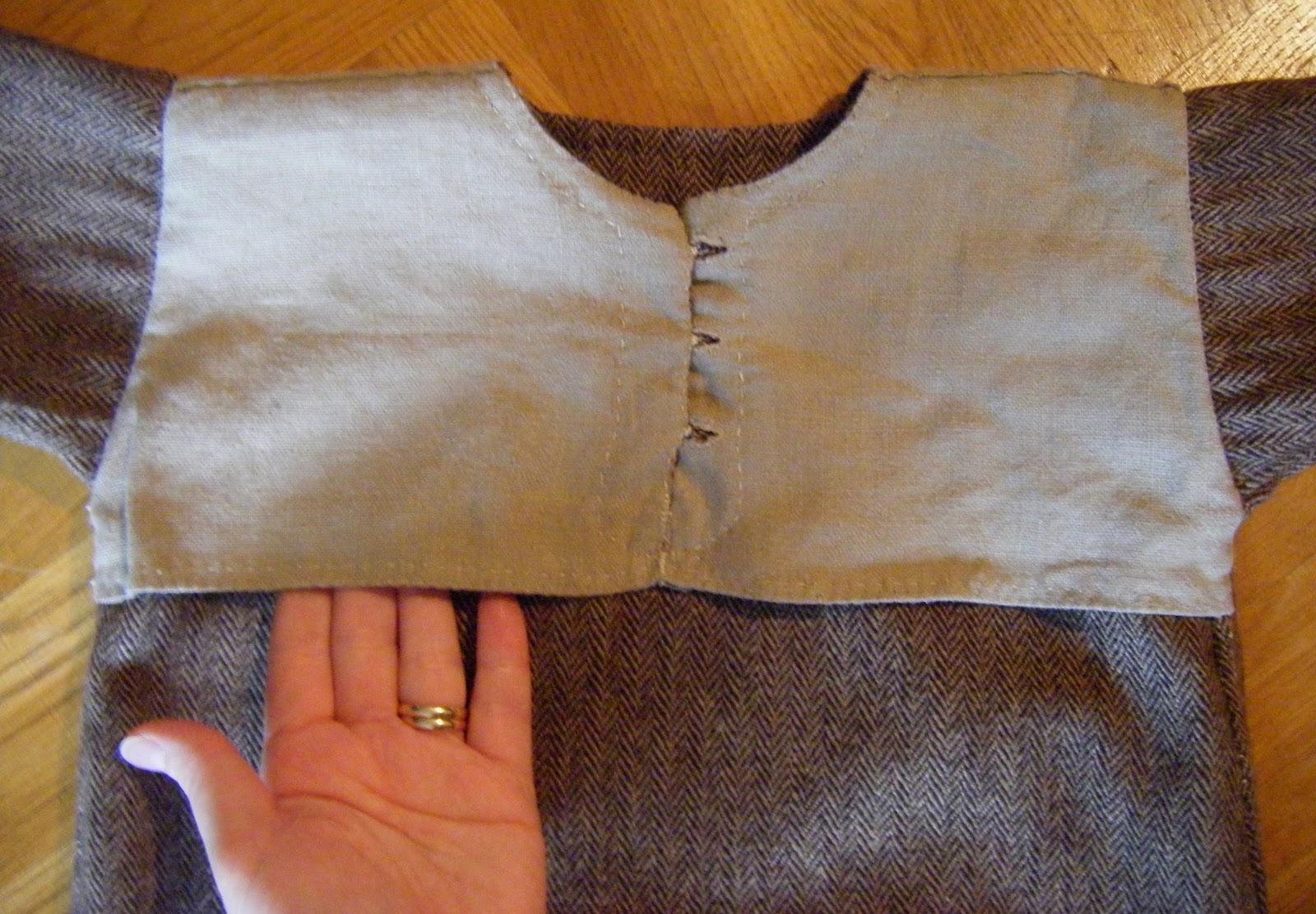 As I don’t want B’s soft baby skin to itch from the slightly scratchy wool, I’ve lined the cotte around the neck and shoulders with worn, very soft linen. The rest of him should be protected by the linen shirt. As I don’t want the lining to show from the outside, it’s only attatched at the neck and armscye.