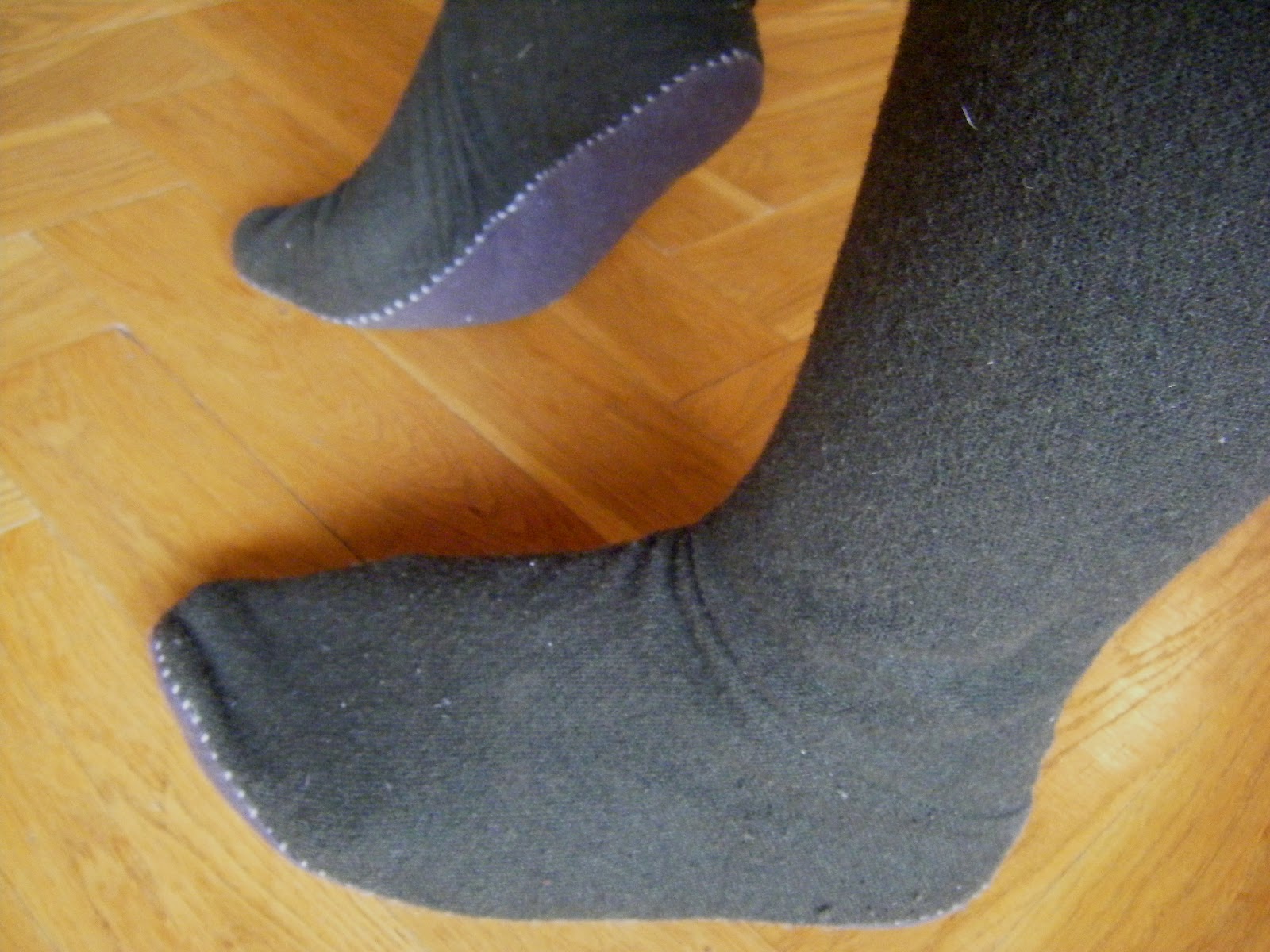 The soles wore out last summer, so I sewed on new ones in thicker greyish wool on top of the old – I think the look of the contrasting soles is rather nice.