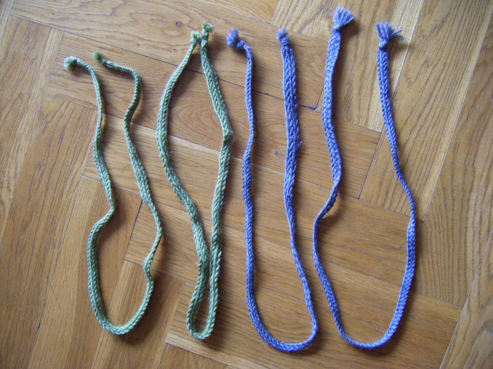 Both pairs of hose are cut on the bias and are held up by garters under the knees. As the garters are not to be seen, they are simple things made from wool finger loop braid. The fact that the braid is a bit stretchy make it very good for garters as one would not wish to have the circulation cut of.