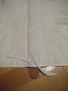 The stays were also a bit small in the hip area, and wouldn’t lace even with the rest. That could have been solved easily enough, if I had chosen to, with gussets in the side seams. As the originals didn’t have hip gussets, in the end, I redid the side seams, taking a little away at the top instead.