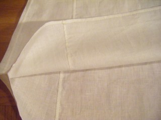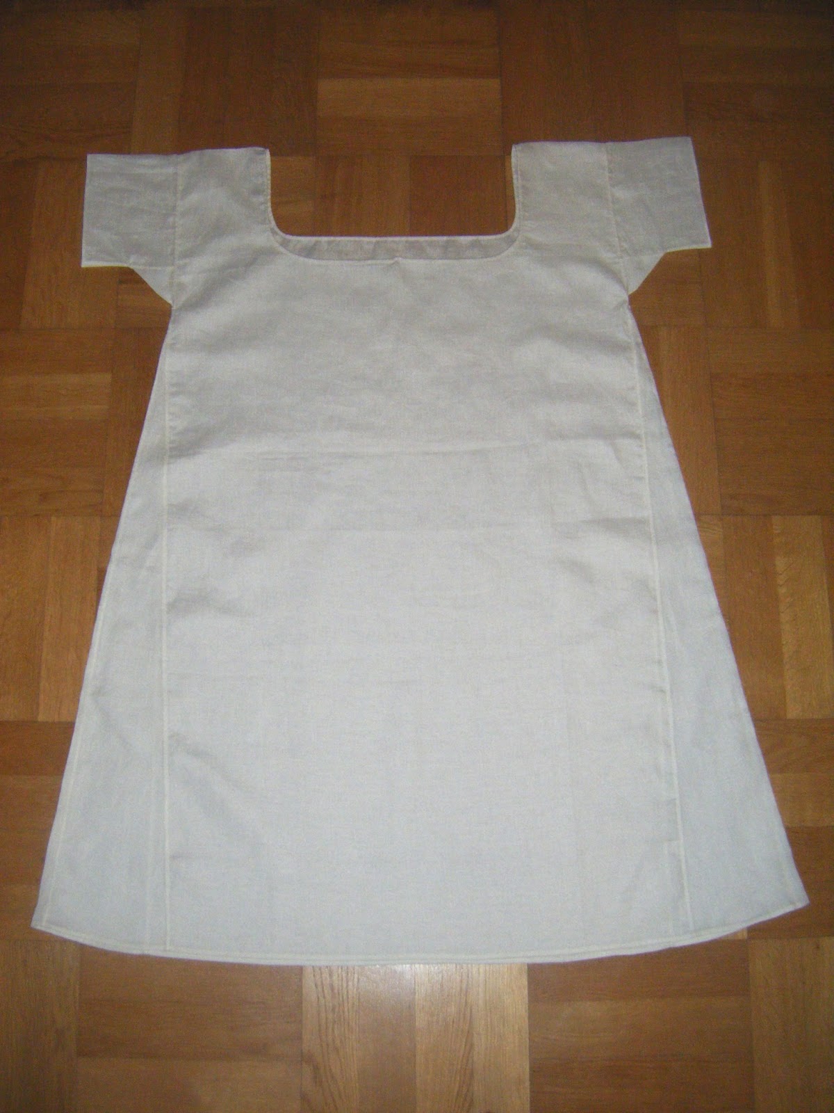 The shift is made from two squares, two gores (each made from two halves, to make the best use of the fabric), and three rectangles. They are sewn together using running stitches and a back stitch every few stitches. The seams are felled and stitched down to one side.
