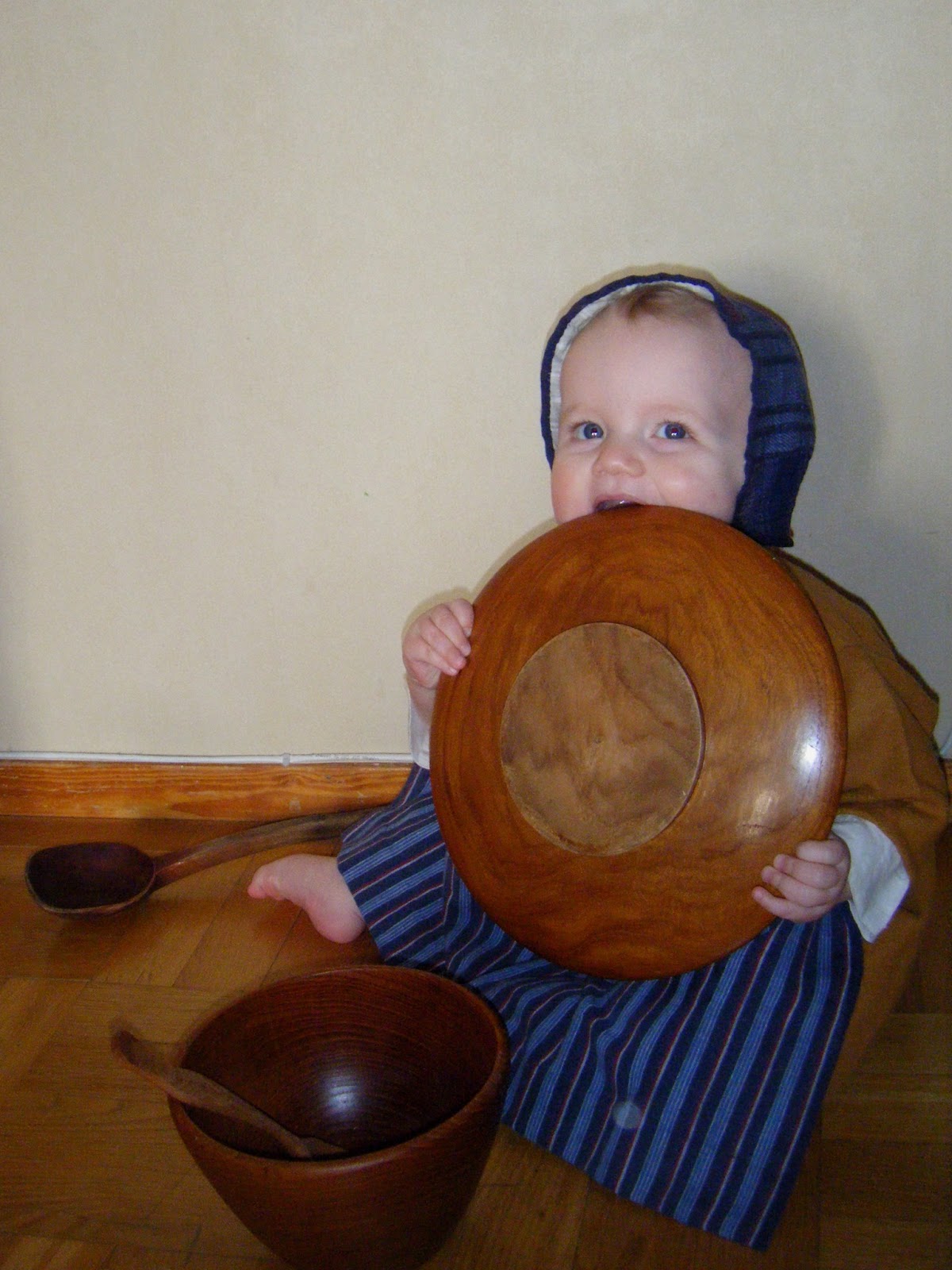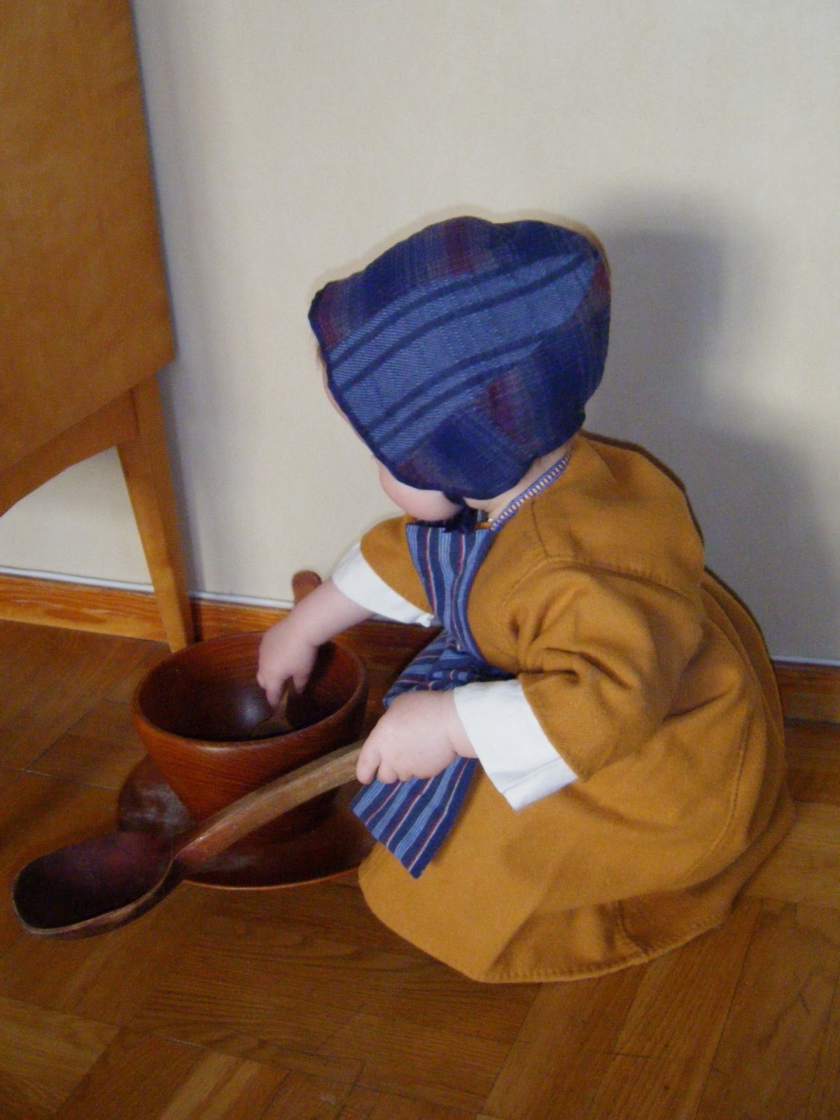 For the sixth HSF challenge I made a cap and an apron for a small country boy in 19thcentury Sweden. After swaddling (still very much in use amongst country people in Sweden at this time) was over, boys and girls were dressed in long gowns, called kolt in Swedish. To this day toddlers are still called “koltbarn” (barn = child) sometimes. I used little B’s 14th century cotte from last year, which still fits well enough, though a tad short. The kolt was worn with a cap tied under the chin (the same kind of cap that had been worn from birth) and an apron.