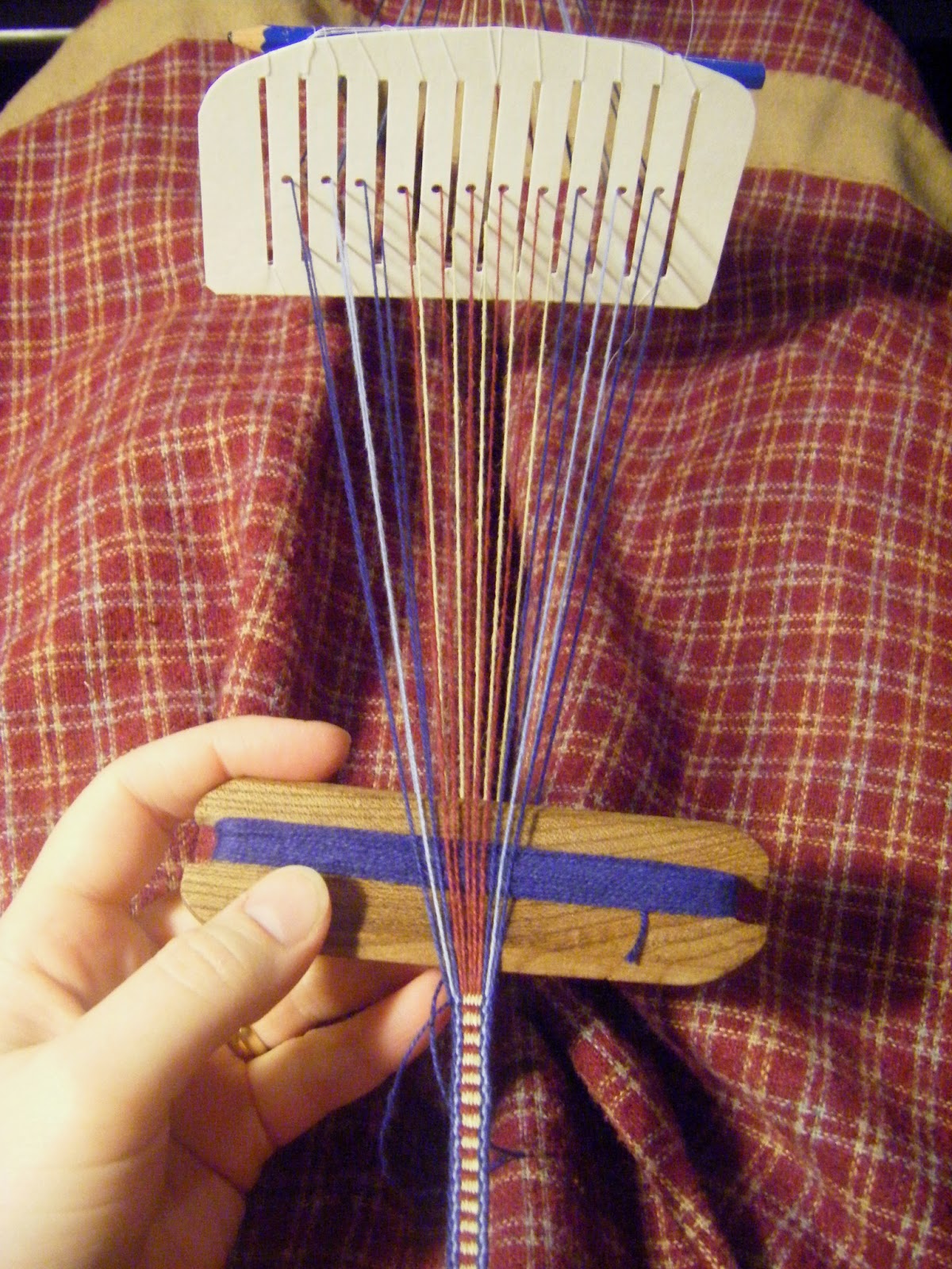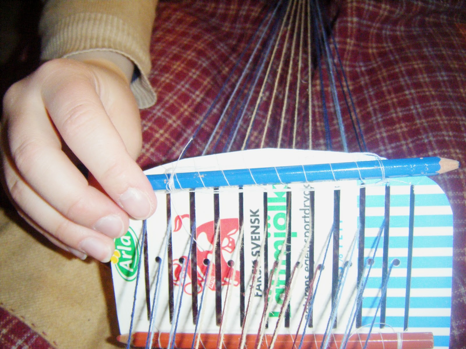 I have a loom for weaving ribbons, but it’s in storage, and how I miss it! For making the ribbon I had to figure out something else. I decided to make a rigid heddle. I want a real wooden one, but that’s not a priority at this time, so I had to make do with an improvised one, made from a milk carton and a couple of pencils.