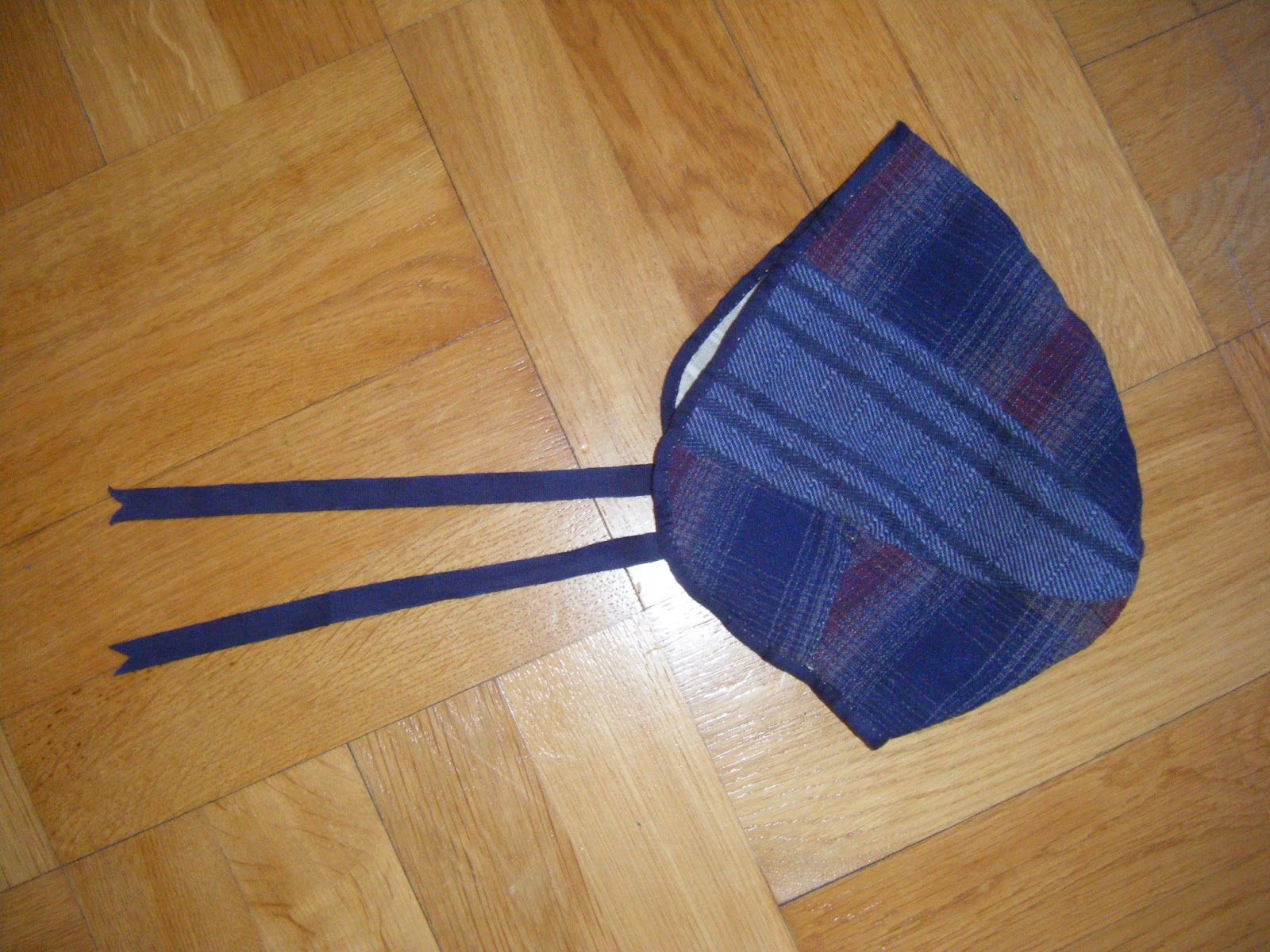 For the cap I used cotton scraps I had in my stash. Seeing more than one fabric in these caps is very common, so I decided to do that. One is a sort of plaid, the other striped (scraps from making a baby wrap, that have seen much use, first with my youngest brother, and then with little B), the lining is a striped, much worn kitchen towel. I decided to put a stitched down tuck over each ear, for better fitting: I don’t know if it’s period, but it looks all right. The cap is bound with cotton tape from my stash, and the ties are made from the same.