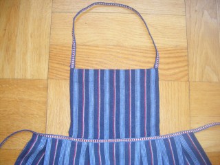 The skirt part of the apron is pleated to the waistband, and the bib sewn in flat. A loop around the neck holds it in place, just like in originals.