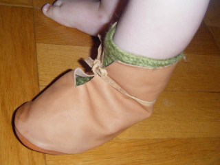 – Shoes for little B. One is stitched, awaiting finishing, the other one not yet begun. They will eventually be front laced, not tied round the ankle as when tried on in the picture.