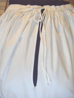 This is a mid 19th century petticoat I made when I was about 17, now 13 years ago. It didn’t fit me very well any longer, hardly surprising after so many years and a baby. It was hand stitched, made of old, good quality cotton sheets. But it had simple, not too even gathers, closed with a button and sewn bar, and the opening in the back had been ripped. It needed some work.
