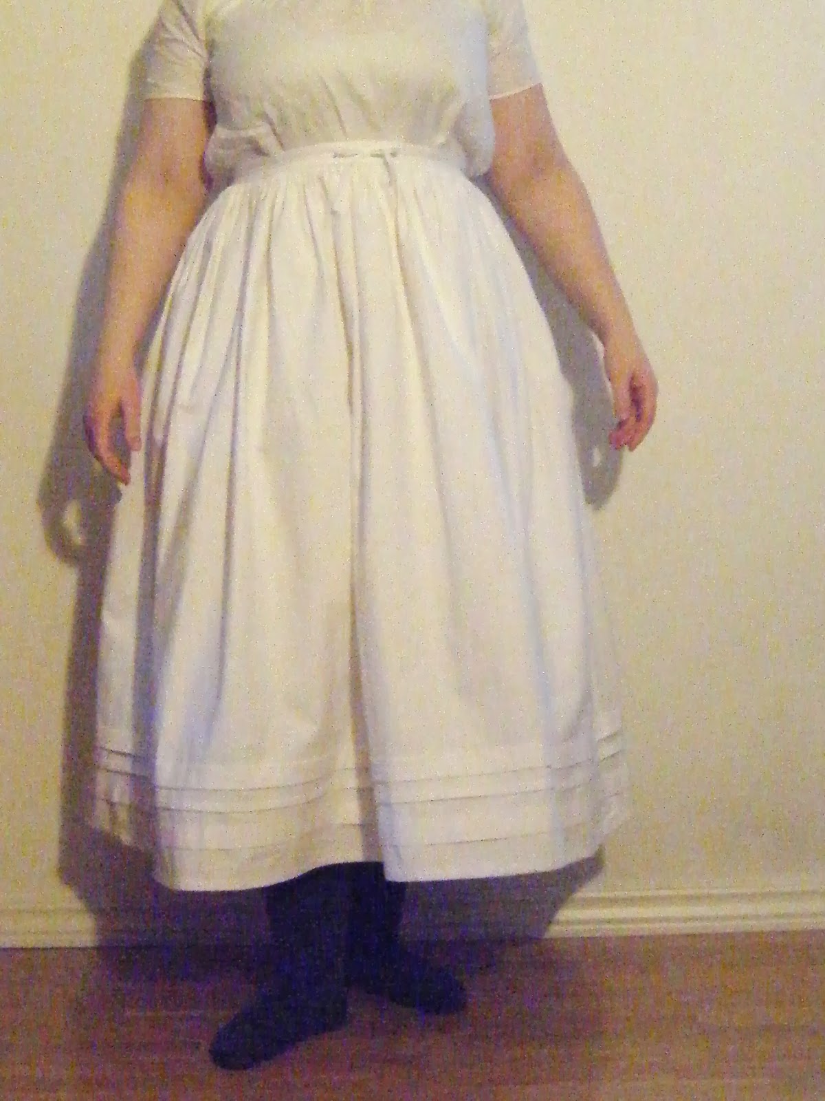 As the petticoat was now sitting lower to prevent bulk at the waist, it was too long. This was good, as I wanted more tucks at the hem. The only thing left to do then, when I unpacked the petticoat the other day, was sewing two new tucks. It might have turned out a tad too short for, say 1850’s and 60’s, but as I plan to make some 1830’s and 40’s dresses sometime when I get a waist again, and would prefer if my old petticoats could work for that, I’m not bothered. For the later decades the petticoats would almost have to be a bit wider ayway.