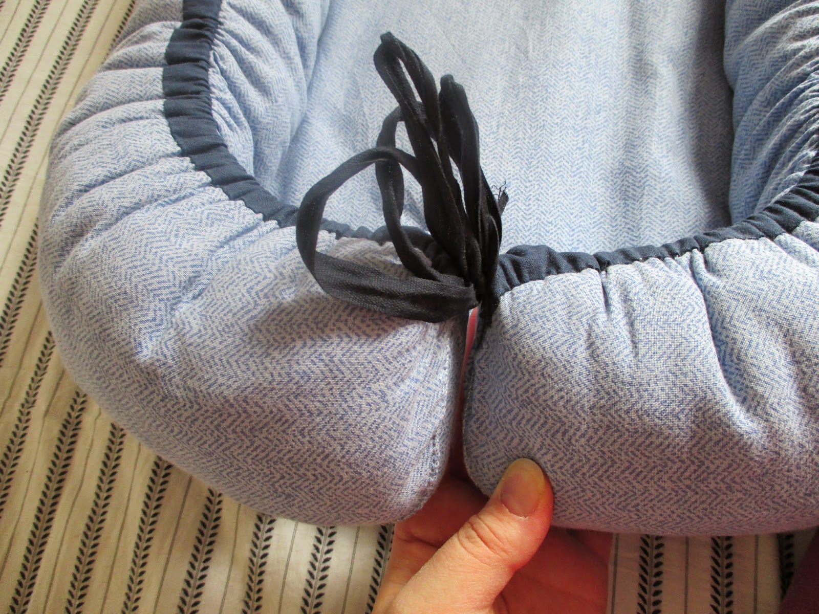The function is quite simple: a padded bottom surface, and padded sides that are controlled by a drawstring, to change the size of the nest as baby grows.