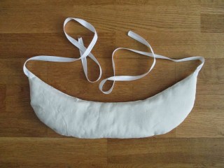 As with everything else I’ve made this year, I only used things already in my stash; off white cotton sheeting, cotton/polyester blend batting (70 and 30 percent respectively) left over from making the babynest, and cotton tape. The night before the challenge was due, I quickly measured how big I wanted the pad, and cut out the desired shape in cotton and batting while baby was sleeping. I then stitched it by hand during the intervals of sleep between the frequent evening feedings. The day after I put the batting in, whip stitched the padded crescent shut, and added ties. Done in time!
