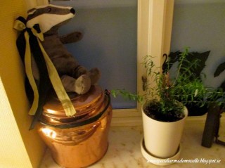 We have a soft toy badger from IKEA: with yellow and black ribbons added I had a Hufflepuff mascot, as a memory of former school days – I was sorted into Hufflepuff House on Pottermore.