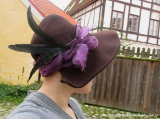Now, the only thing I had to do was line the brim and trim the thing. Simple enough. I didn’t want the lining to differ too much in colour from the bonnet, and I was lucky enough to have an old, worn out blouse in my stash. It was brown, with a woven in pattern. I just cut a straight piece from it and stitched it to the inside of the brim, with the width taken up in pleats where brim and crown met.