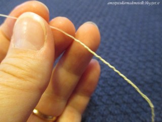 I did try one thing to get closer to historical accuracy though: I did not use needles when sewing. In period, the waxed linen thread was twisted round a bristle, but as I don’t have any, I used fishing line instead, as advised by Sofia and Henrik. It took a bit of practice – at first it wouldn’t work at all, but after more advice and practice, it worked quite well, and I can see it working excellently with more practice.