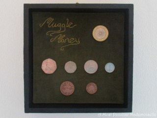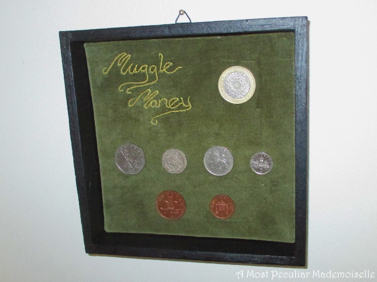 Said and done. I took out an open frame I’ve been meaning to give a makeover (it was a white shabby-chic thing), and painted it black. I covered a piece of thin cardboard taken from a corn flakes carton with a scrap of green velvet from my stash, and embroidered “Muggle Money” on it, through the cardboard and everything for stability.