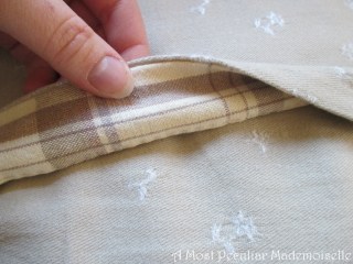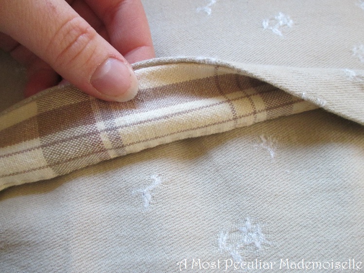 I made the covers with a deep overlapping in the back so they would look nice even without additional closure, as I didn’t feel like making more buttonholes. As I only had just enough fabric for the covers without the deep hems I wanted, I faced the openings with strips of beige check cotton fabric left over from lining the bodice of my insanely pieced dress a few years ago. Though it doesn’t really show, a detail like this makes me glad.