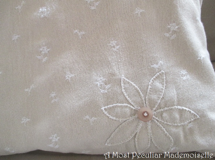 The fabric had a few heavy dark stains that wouldn’t go away in the wash, and I didn’t have enough material to cut around them. As a solution I made a self-fabric appliqué flower with an orphan button from stash as the centre. The placement is a bit odd, but it’s way better than the stains.