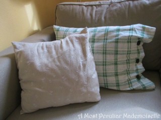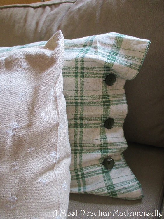 As spring was approaching I wanted new covers for the sofa cushions. With this in mind I had eyed an old apron that I made many years ago when just starting out making historical clothing, but has since been demoted to the fabric stash for not being period enough. It had a print of green checks on an off-white base, with flecks of beige giving it a “rustic” feeling. It just didn’t cut it as a 19th century apron, but I thought the green would work well for spring cushions. Said and done, I cut down the apron, stitched up the covers, and added three green buttons from stash for closure on each. That sorted the two larger cushions, but I had three smaller ones that needed new covers even more.