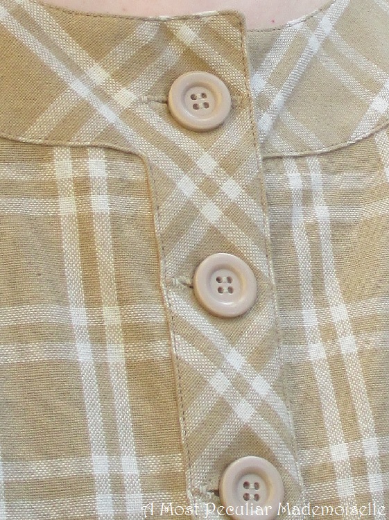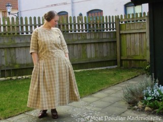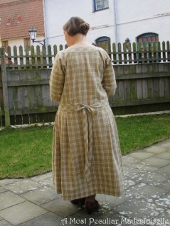 Inspired by the dresses worn by the farm wives of Bullerbyn, I used a checked cotton fabric that my mum gave to me many years ago. I used the sketch by Jen Thompson as a starting point, but changed it to my measurements. I also made it all in one piece by removing the shoulder seams (inspired by several dresses in period photos), and made darts at the shoulders for a little bit of shaping. I made it front opening, and made the sleeves longer.
