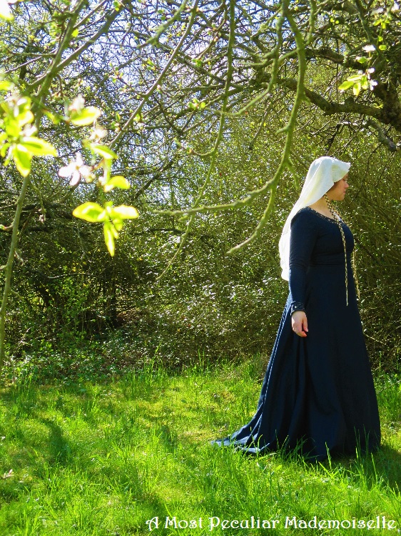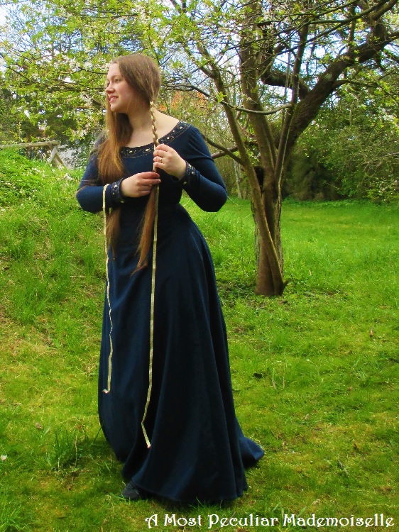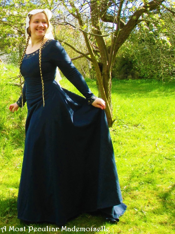 Since I recently weaned Little One I can suddenly fit into dresses that didn’t fit in the bust area before. I managed to wriggle into the embroidered dark blue medieval-ish wool dress I made about 15 years ago (it even laced shut!), but never had nice pictures of myself wearing it.