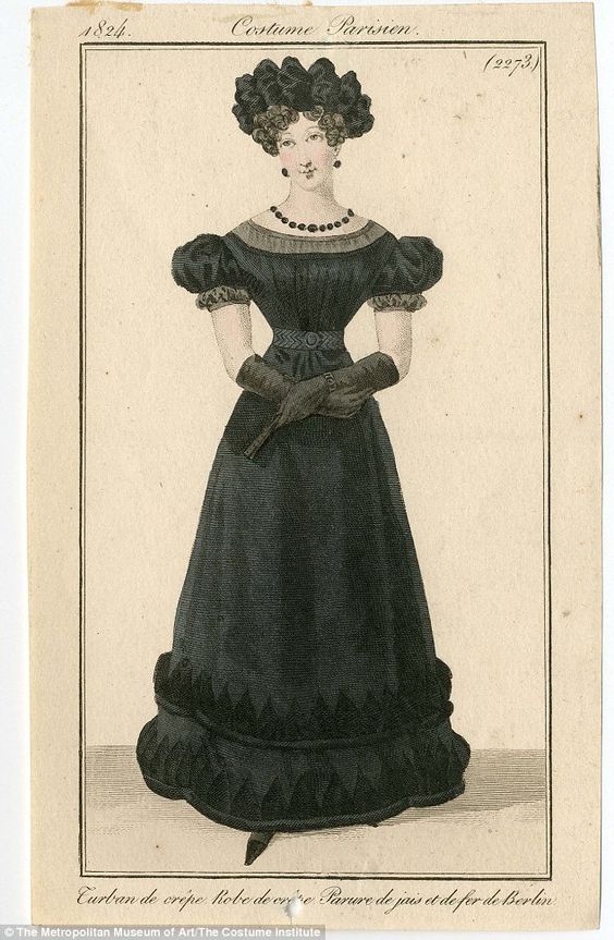 Black came back with vengeance in the 19th century as the ever more important must have colour of any woman’s mourning clothes. Fashionable mourning was so popular that many upper and middle class ladies in Stockholm wore it even for deaths that didn’t concern them personally, and wasn’t even subject to official national mourning, like when Crown Princess Josefina’s father, the Duke of Leuchtenberg (adopted stepson of Napoleon I), died in 1824.