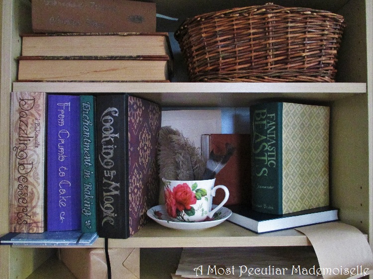These books are made to look good even when seen from the side, and they are a great way to hide my Muggle cookbooks; just put a faux cover around one or several cookbooks and they’re hidden with very little effort. Fantastic Beasts only have a proper cover on one side though – it’s made more in the fashion of the faux book spines mentioned above, and the side that does not have a cover has holes punched in it, so it can be attached to the row of faux book spines but still look good from the side, if I want to put them in a more open place in future.