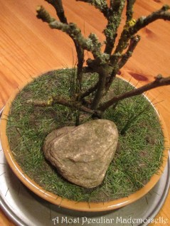 First I “shopped my house” for a suitable bowl. The one I decided on is a fairly shallow ceramic one. I had picked some pleasantly knotty and twisted twigs from a plum tree. This particular bowl was obviously too shallow for the twigs to stand up properly, even when stabilized with soil, so I wrapped aluminium foil round the bottom of the twigs, then flattened the foil to make a base. Of course I forgot to take a picture of this vital step – if I remember I’ll take one when I take the scene down.