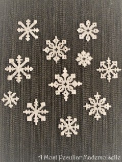 I used this template for the ballerinas, but edited out the skirt, which I then cut out of thin cardstock. I chose to make all three of them hold the same pose, to echo the feel of a corps de ballet, but made the tutus different, just as no two snowflakes are alike. The tutus were made from classical folded and cut paper snowflakes. I made the ballerinas rather smaller – 13,5 centimetres (5 5/8″) from head to toe, smaller than my hand – than the inspiration pictures, as I think smaller quite often is prettier. I cut the snowflake tutus up the back, and glued them together again, using strips of paper, once they were in place on the ballerinas. The join is almost invisible.
