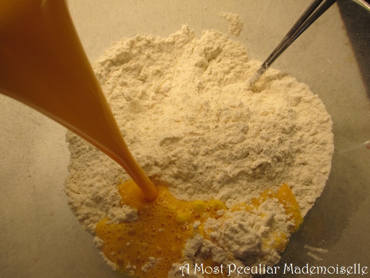Pour the finger warm saffron buttermilk over the flour mix, and stir thoroughly. Add more flour if needed.