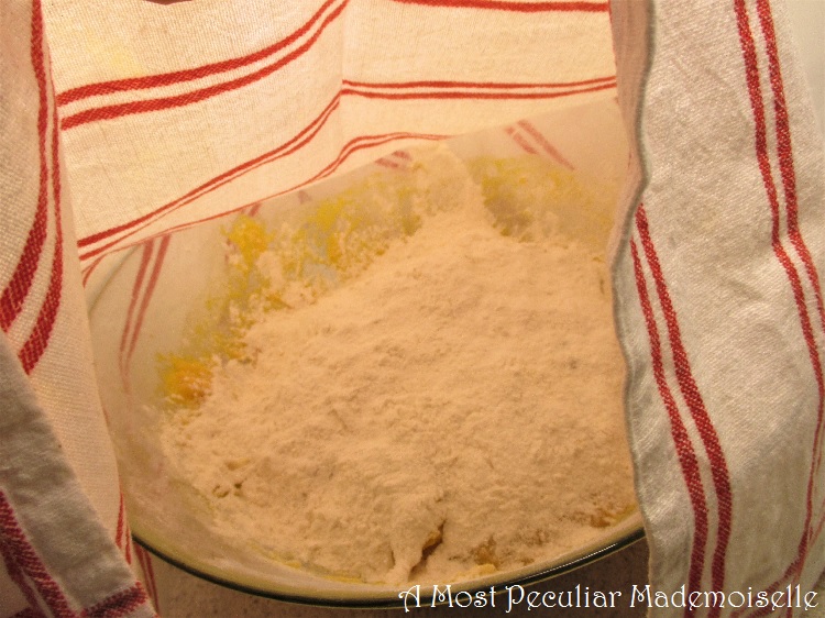 When the dough is of a good bread dough texture, letting go of the bowl, sprinkle it with flour, put a tea towel over it and let it proof to double size. (Note: if in doubt, better leave the dough a tiny bit too wet than to dry. It’s easier to add flour later if needed, than to remove any.)