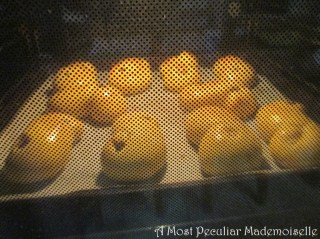 The buns have proofed enough when they spring back when gently poked. Give the buns an egg wash and put them in the middle of the oven, at 225-250 degrees Celsius. Depending on your oven, it will take about 5-10 minutes – they should be golden brown on top when finished.