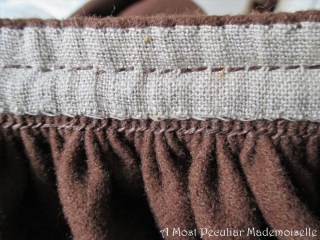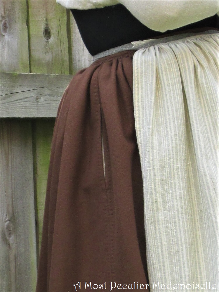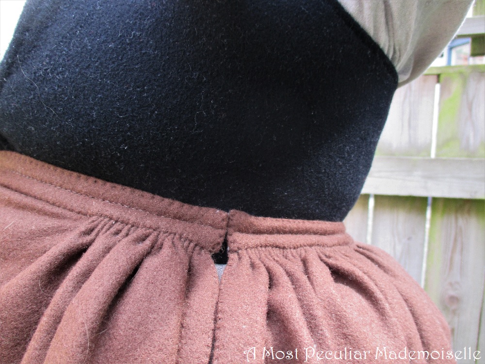 The skirt is smooth in front, as seen in extant skirts, and has the fullness taken in by stroked gathers at the sides and back, that are secured with rows of stitches, seen only from the inside.