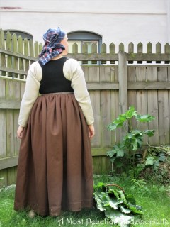 I don’t know how they did about pockets – in some mid-19th century folk costume skirts there are stitched in pockets, like in modern skirts of the time, but for earlier decades I’m unsure if they wore loose pockets or not. I left a slit open in the right side seam anyway, so if need be I can tie a pocket round my waist.