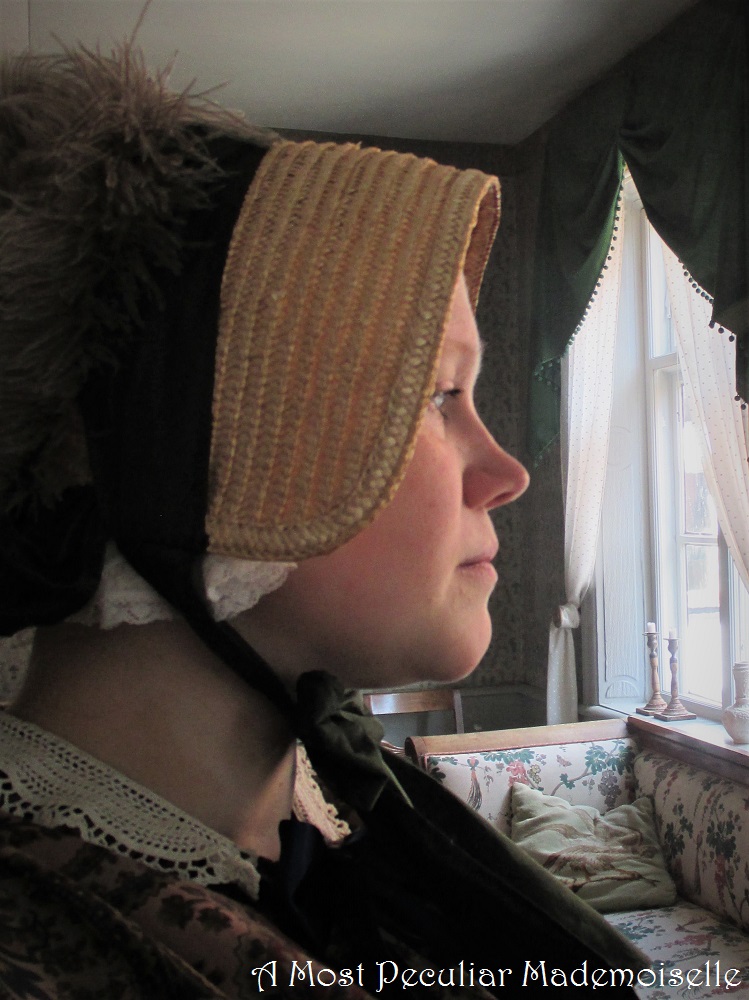 But the bonnet snagged my hair, so after consulting knowledgeable people I made a half lining using a thin cotton fabric. Not the most historically accurate fabric for this, but it had to do.