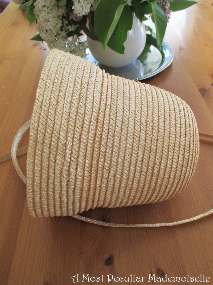First I unpicked the stitches holding the straw braid for a few feet, so I could use that to edge the finished bonnet with. You can see the crease where the brim was originally folded upwards.
