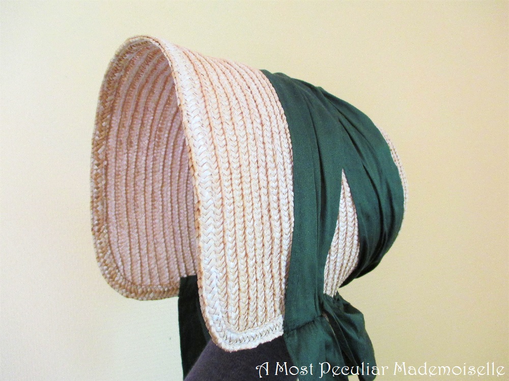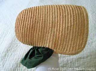 Then it was time for trimming. This was an all-stash project, so I picked out a scrap of green silk dupioni. Taffeta would have been better, and taffeta ribbons best of all, but I didn’t have any. I hemmed strips of the silk for ties and trim. I wasn’t quite happy with the straw bavolet, so decided to cover it with a silk one that I gathered to the proper length using whipped gathers.