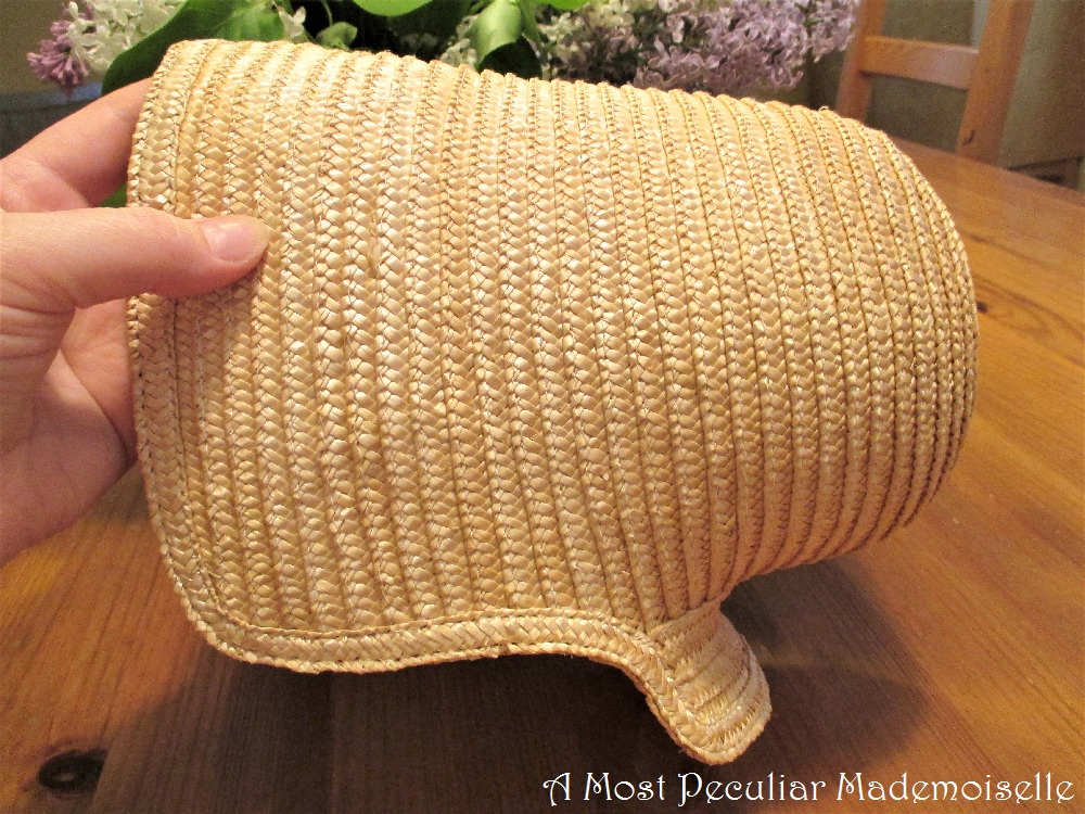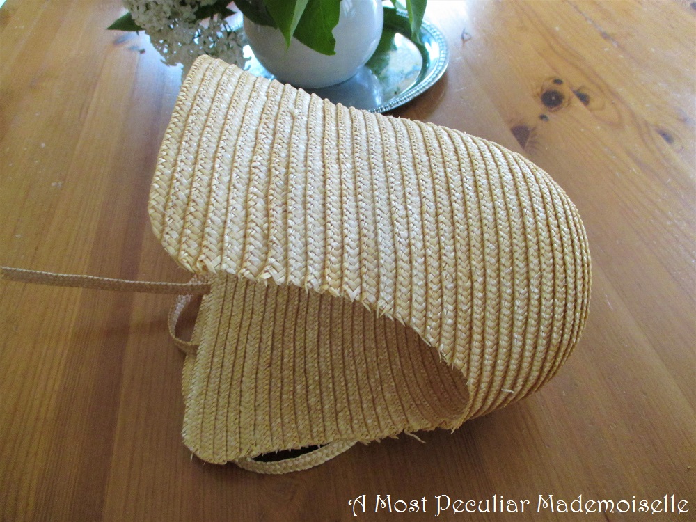 Then I dunked the bonnet in water to make it less brittle and cut out a piece for the neck. I had a plan for the cut-off pieces of braid, but later I thought I should have curved the brim down towards the chin instead of cutting it straight. You live and learn.
