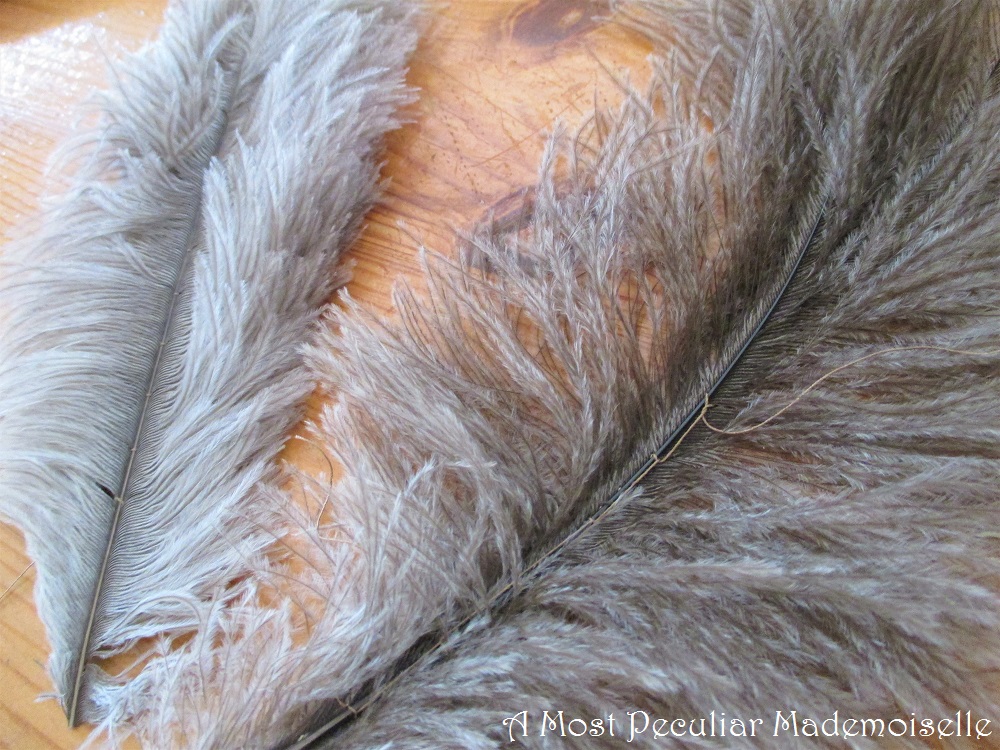 Then I was a bit unsure if I should leave it as was – after all, it looked very pretty that way – or add ostrich plumes. As I was dressing as a close to middle aged, married bourgeoise woman, I decided more was more in this case. I had some ostrich feathers that had fallen out of my feather duster and been saved for a moment like this. I picked out four, and stitched them together two-and-two with silk thread to make them fuller.